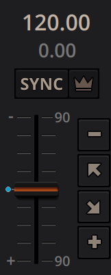 Pitch Control: This changes the track pitch independent of the tempo. Left-clicking the - button decreases the pitch by one semitone. Right-clicking it decreases the pitch by 10 cents. Left-clicking the + button increases the pitch by one semitone. Right-clicking it increases the pitch by 10 cents.