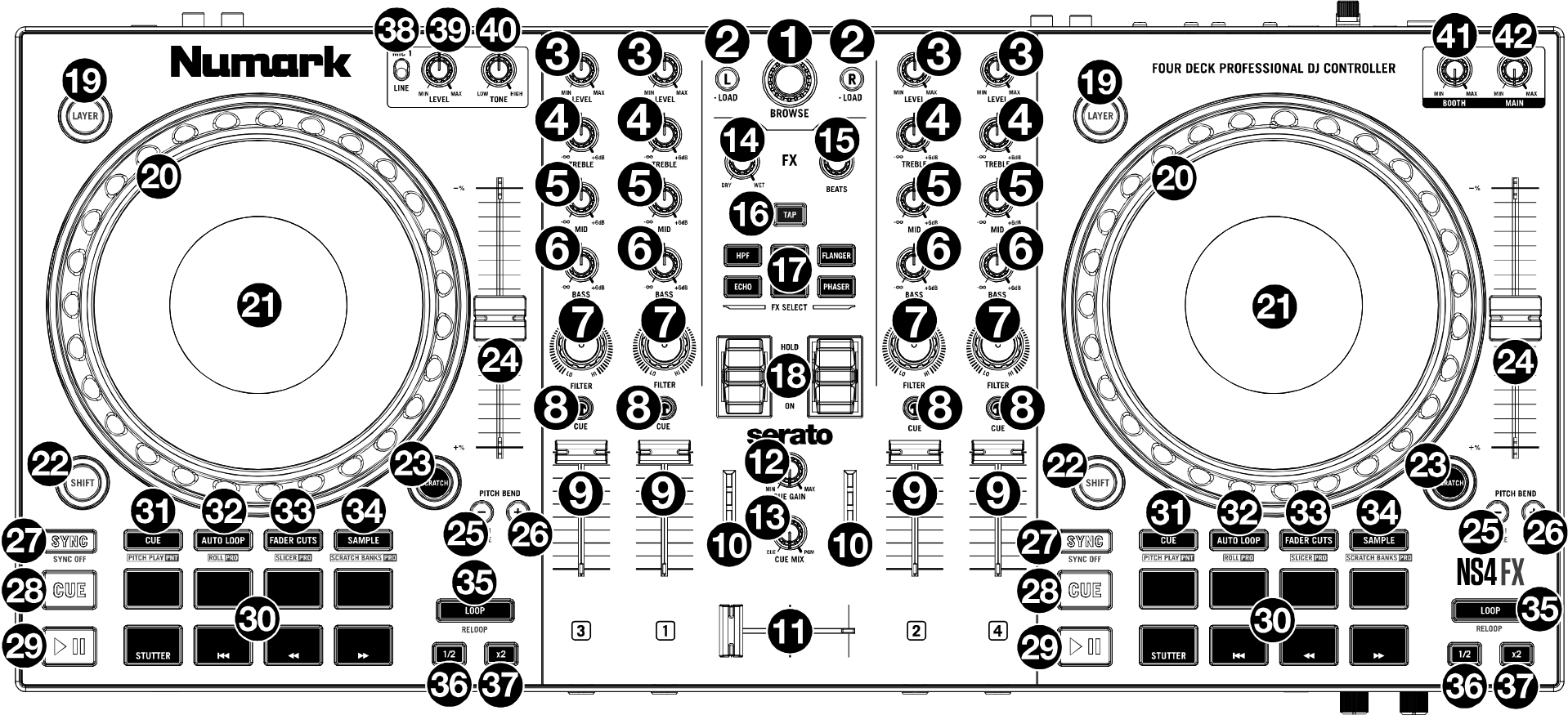 30. Performance Pads: These pads have different functions on each deck depending on the current pad mode. See Performance Pads: for more information to learn how to use the pads in each mode.